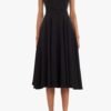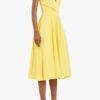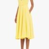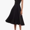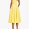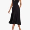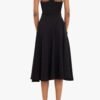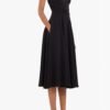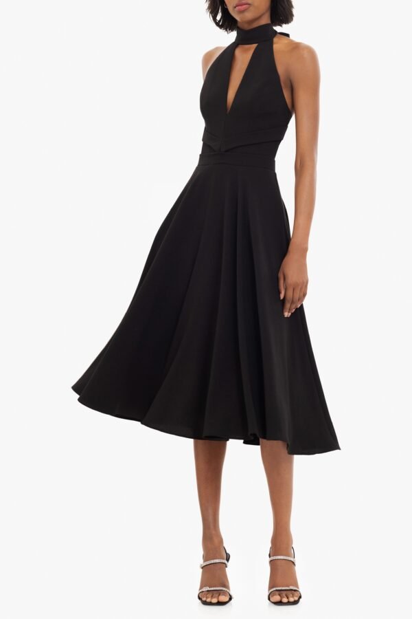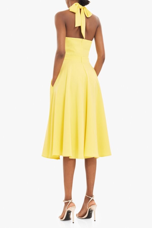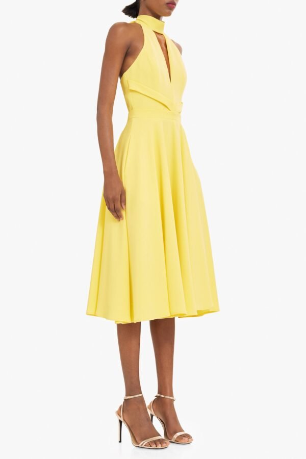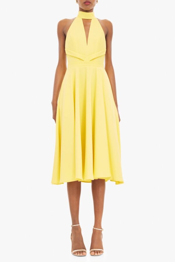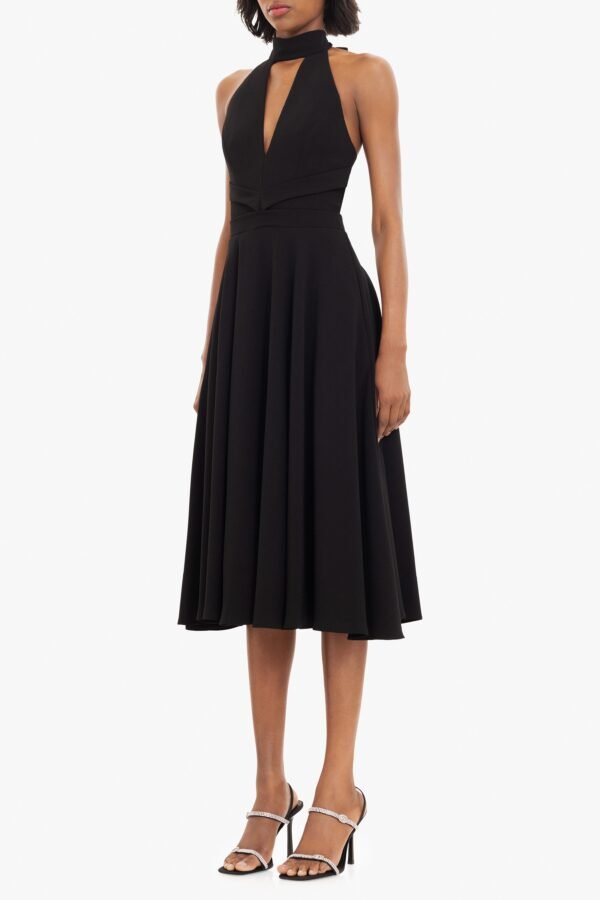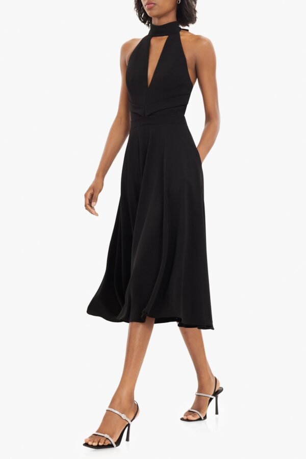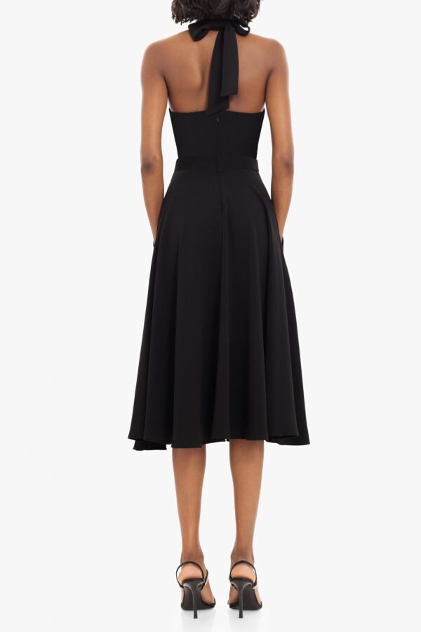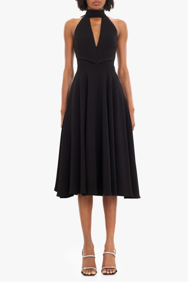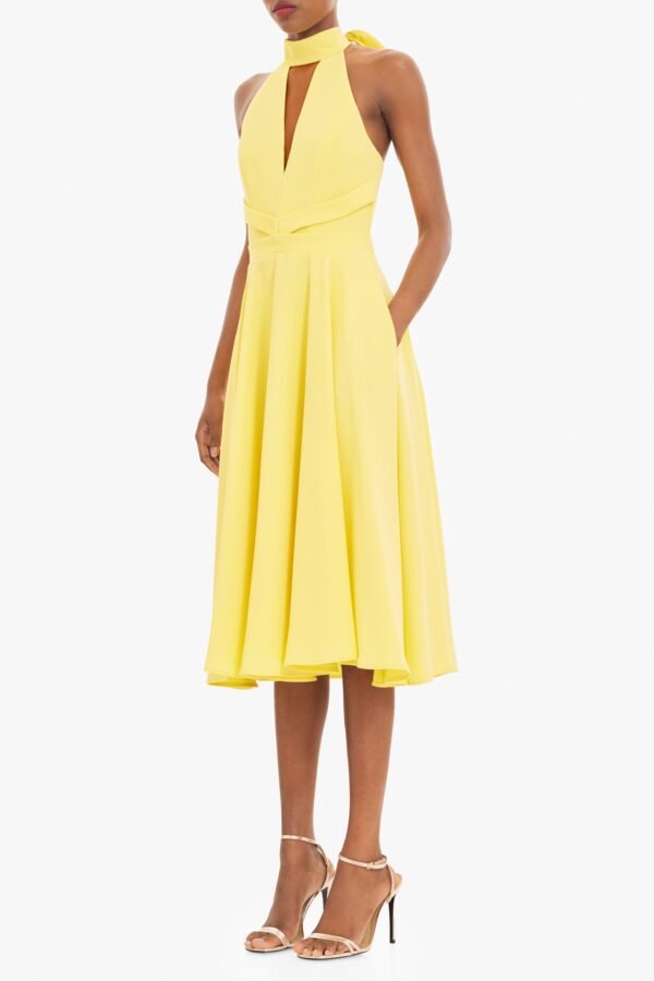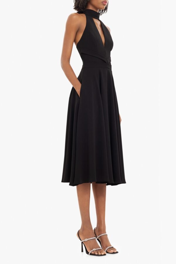 The Caelith Midi Dress is designed to highlight the waist and flatter the neckline. The deep V-neck is complemented by a sleek mock neck cutout and ties at the back for an adjustable fit. A full midi skirt adds graceful movement. while discreet inseam pockets offer everyday ease. Perfect for evening soirées or elevated daytime events.