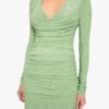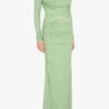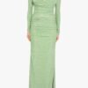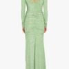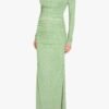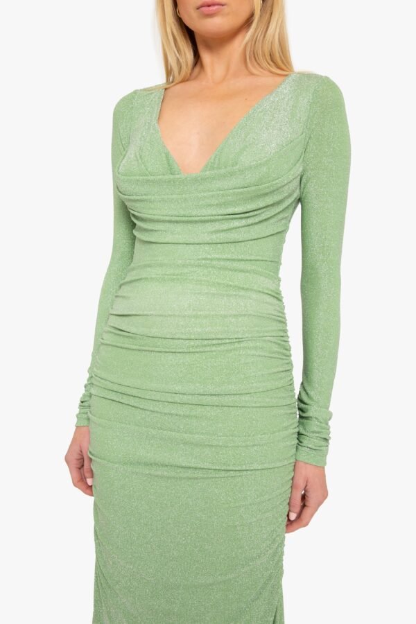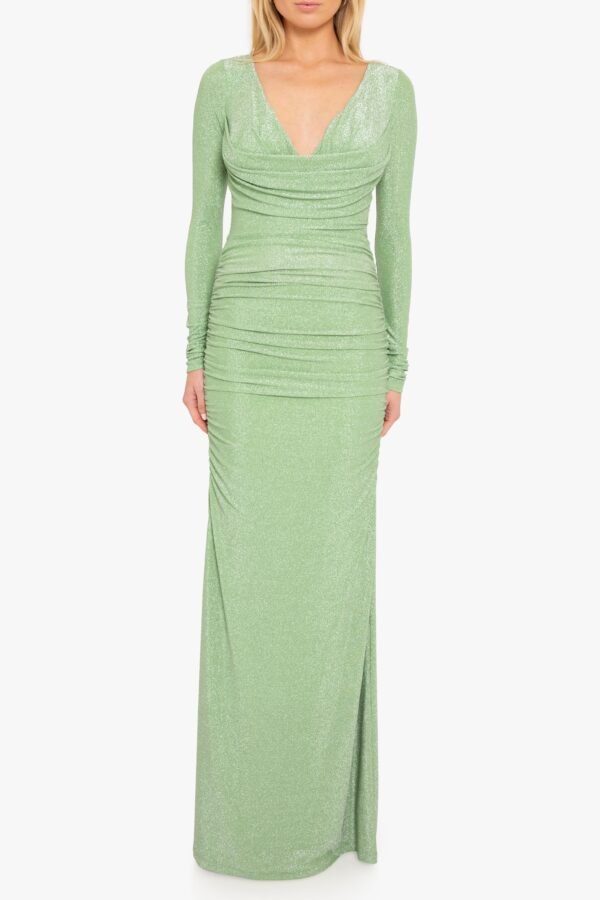 The Rafaela Maxi Dress features a draped V-neckline that adds a touch of fluidity to the bodice. Made in a textured stretch lurex knit. thoughtfully placed tucks sculpt the waist. while shirring along the skirt enhances the silhouette. creating a flattering and elongating effect. Designed with long fitted sleeves and a streamlined floor-length hem. this gown offers a sleek yet refined appeal.