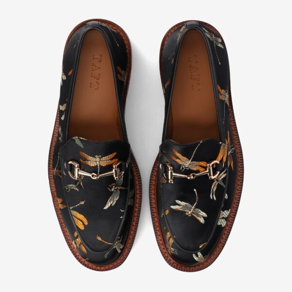 The Fitz Loafer in Black Dragonfly from TAFT features an exquisite jacquard weave. handcrafted in Spain. This stylish loafer combines intricate detailing with superior craftsmanship for a distinctive look.