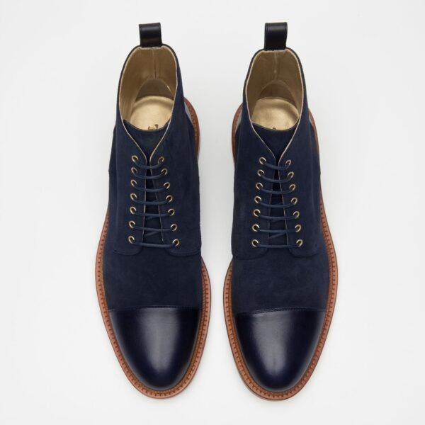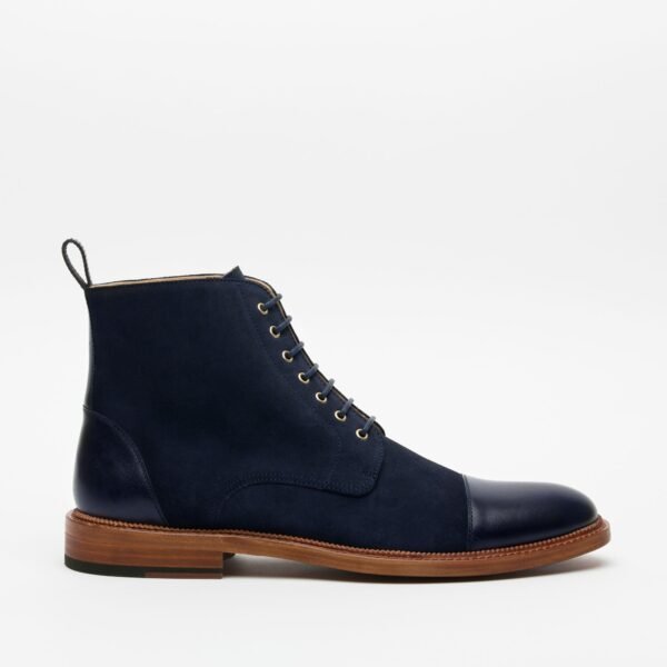 Meet the Troy boot in Navy…your new party boot. The perfect balance of sleek and rugged. this boot is a new variation on our classic Jack boot. With an incredibly substantial suede and a full leather lining. the Troy boot is as durable as it is comfortable. It features a reinforced. stacked leather sole with rubber inserts. As always. we spared no expense and opted for the highest quality materials available. The Troy Boot in Navy features gold details and highlights in the leather lining. the eyelets. and the tips of the laces. Wear this boot when you want to get attention.