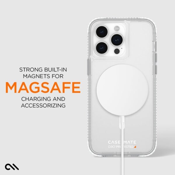 Stay strong. stay protected. The Tough D3O® Clear case is built to last day and night for ultra-strong phone protection. D3O® uses a self-strengthening. non-Newtonian technology that offers the thinnest. strongest. and the world’s best impact protection. The science behind this material is incredible– so yes. you can really drop it. With addedD3O® protection. feel confident your phone is safe with 16-foot drop protection. Strong built-in magnets allow for easy MagSafe accessorizing and charging.